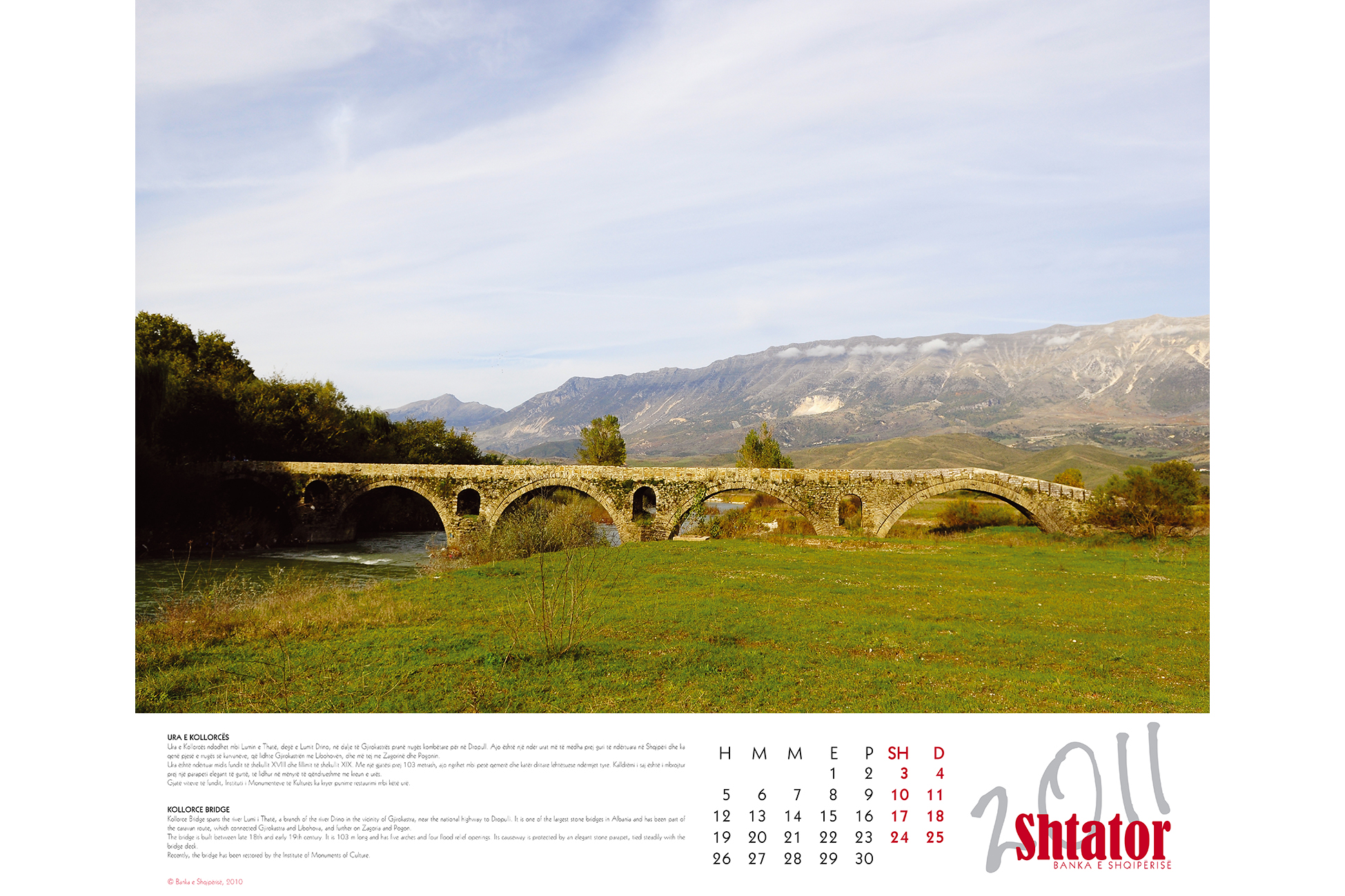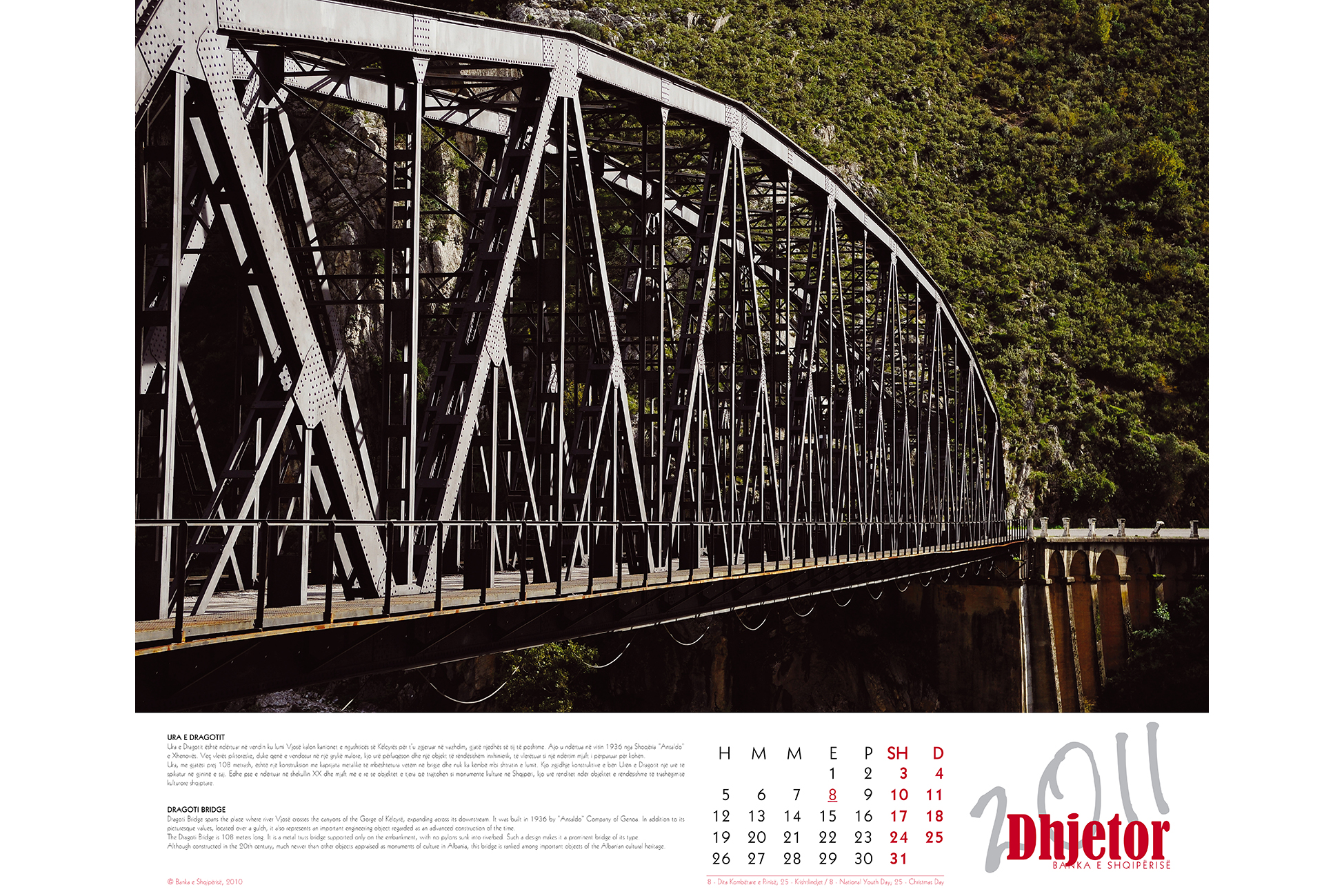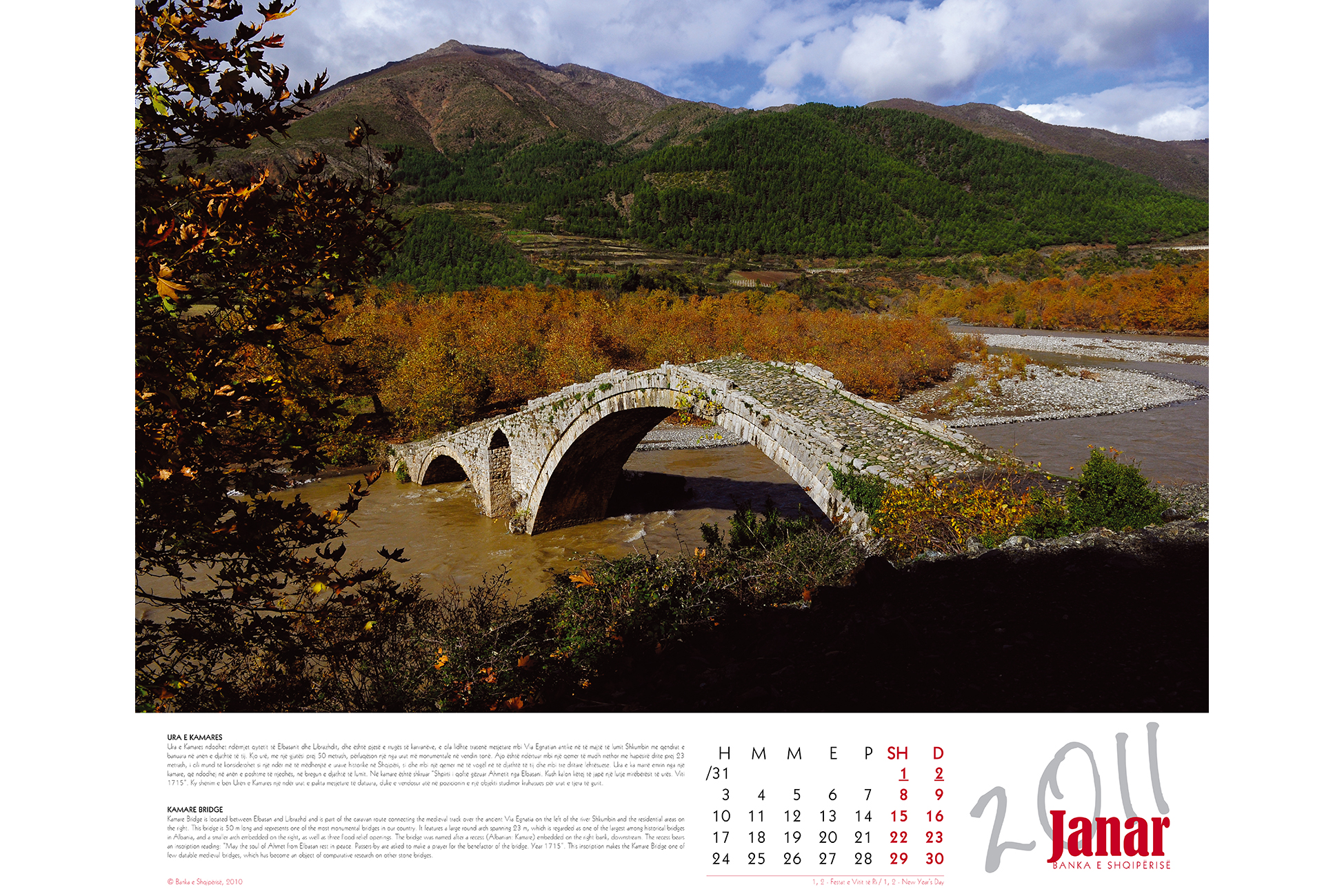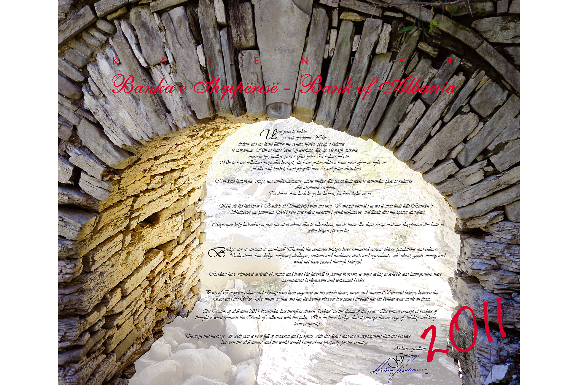 - The Bank of Albania 2011 Calendar has therefore chosen “bridges” as the theme of the year. The virtual concept of bridges of thought is what connects the Bank of Albania with the pubic. It is on these bridges that it conveys the message of stability and long-term prosperity.
